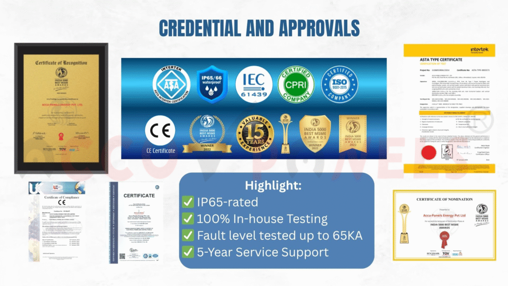 Unlike legacy 415V architectures retrofitted for higher voltages, Accu-Panels Energy Pvt. Ltd. engineers 800V LT ACDB panels from scratch—for the specific challenges of MW-scale solar plants utilizing string inverters.